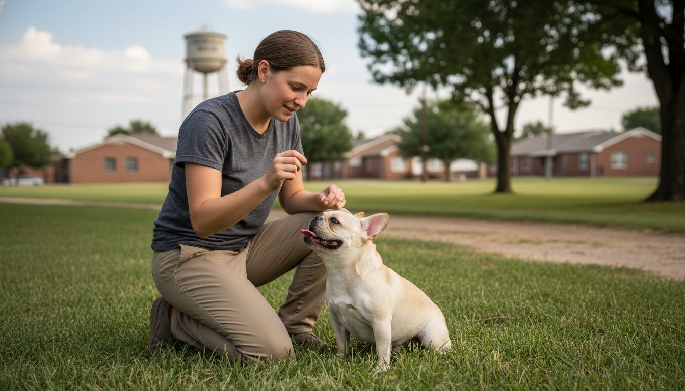 Basic obedience includes skills like sit, down, stay, recall, and loose-leash walking. These are the building blocks for a manageable dog at the Caddo Mills City Park or when exploring nearby areas.