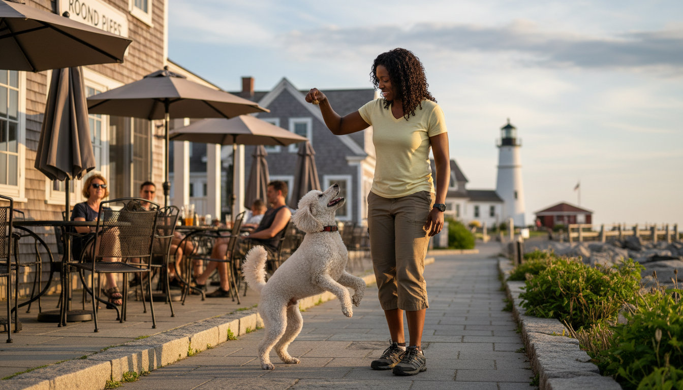 Basic obedience training**** covers essential cues like sit, down, stay, and a solid recall. These skills are the foundation for safe visits to busy areas like Perkins Cove or quiet walks in the woods.