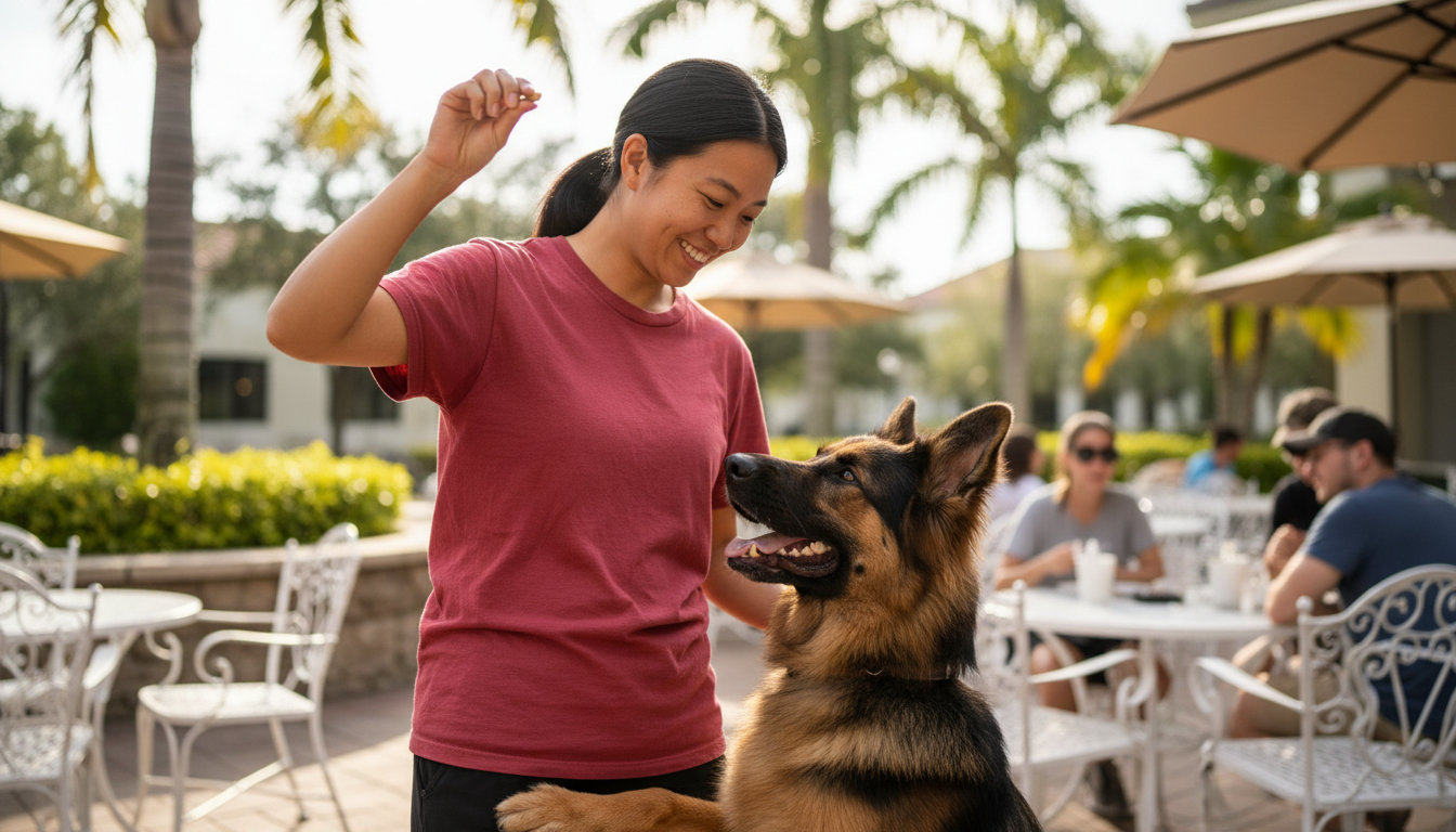 Basic obedience covers sit, down, stay, come, and loose-leash walking. These skills are the foundation for safe visits to Coconut Creek parks and outdoor dining areas.