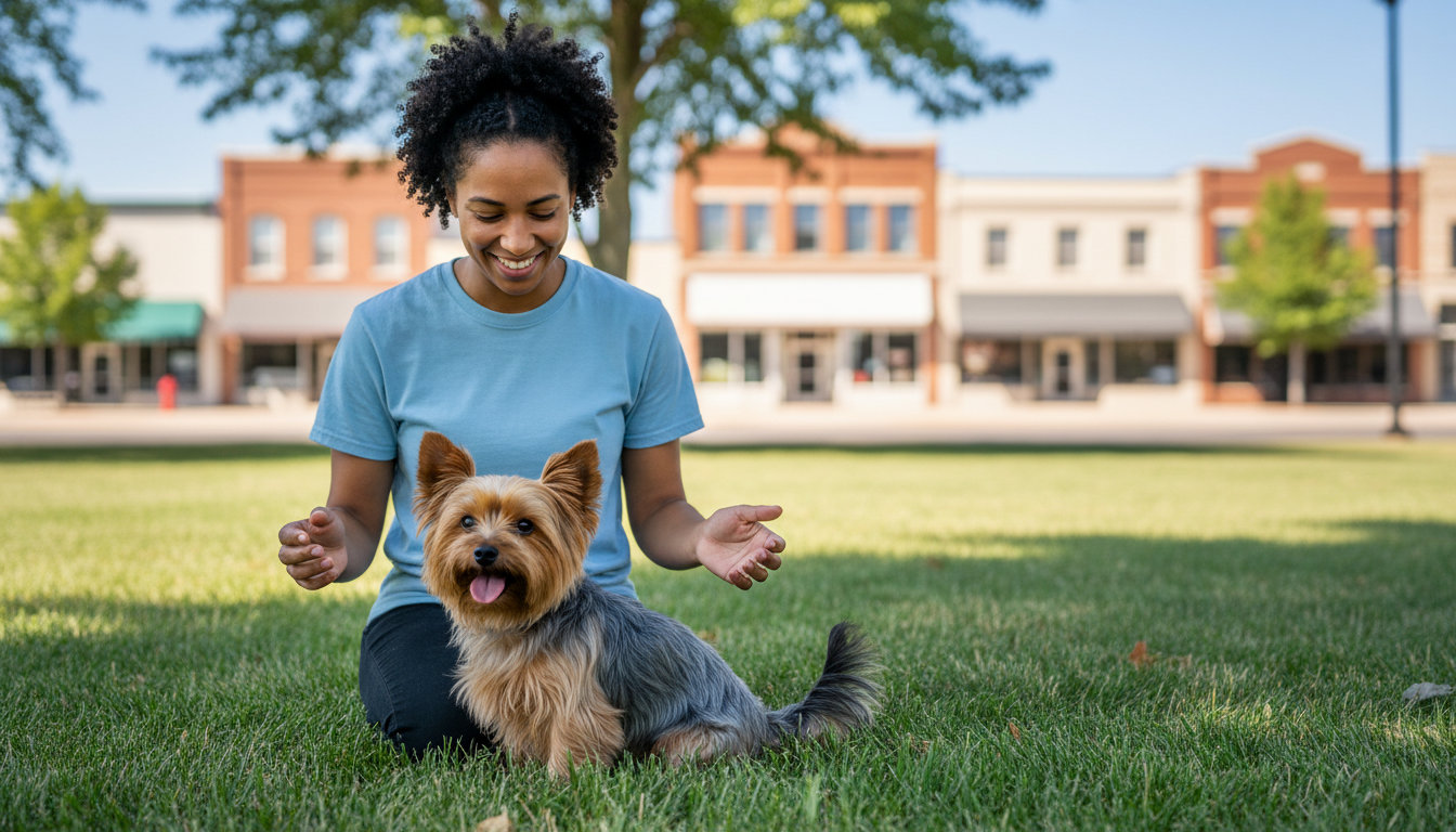 Basic obedience covers sit, down, stay, come, and loose-leash walking. These are the foundation for any public outing in Emerson, from a walk to the post office to a patio visit.