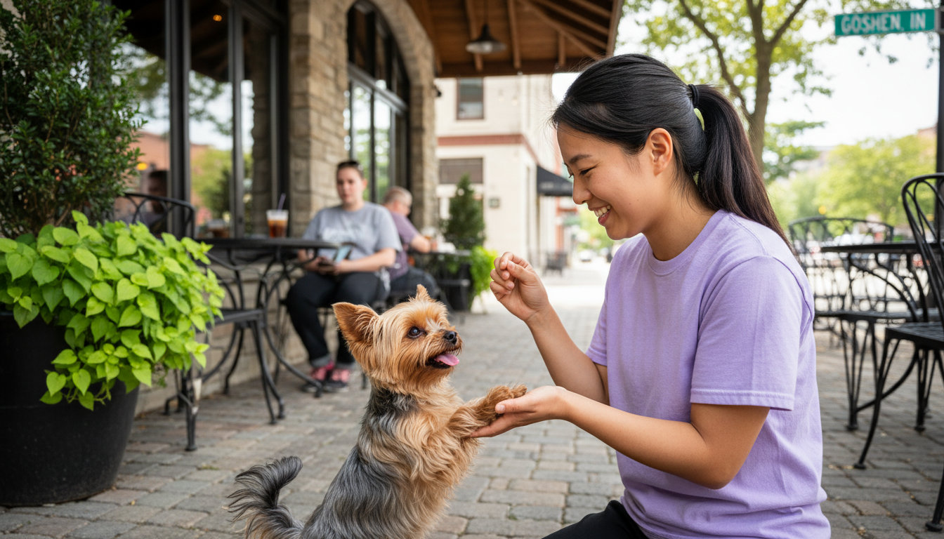 Life with a dog in Goshen means peaceful walks along the Mill Race Canal, visits to Shanklin Park, and enjoying the local farmer’s market. Your dog needs to navigate these spaces with good manners, from not pulling on the leash past the Goshen Theater to staying calm around kids at parks.