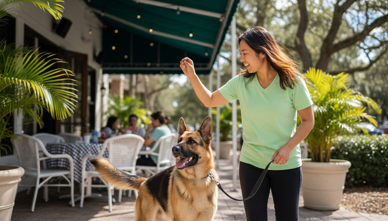 Basic obedience covers sit, down, stay, come, and loose-leash walking. These skills are the foundation for visiting local parks or outdoor dining areas safely.