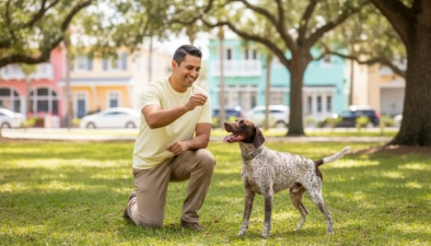Basic obedience covers sit, stay, come, and loose-leash walking. These are the foundation for safe walks in Henderson Park or down gravel roads.
