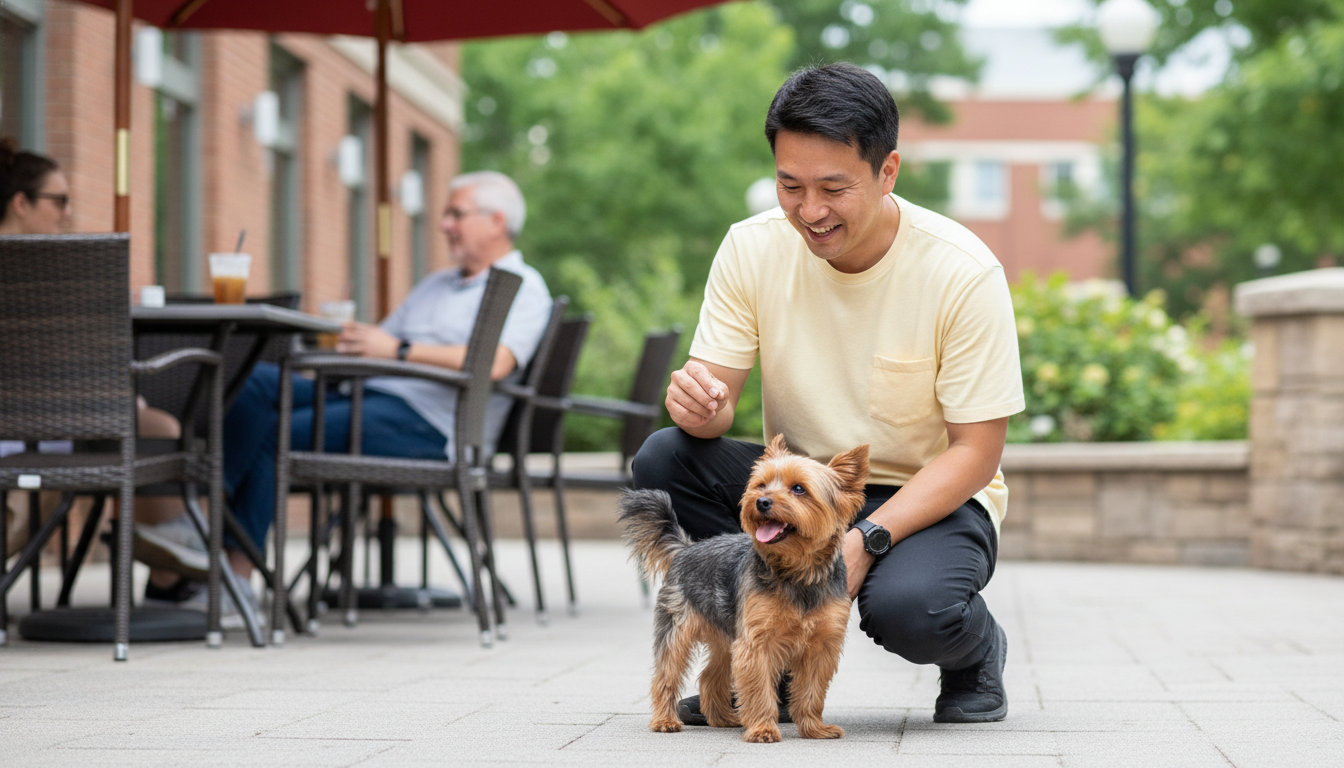 Basic obedience includes sit, down, stay, a solid recall, and loose-leash walking. These are non-negotiable skills for safely navigating neighborhood blocks and enjoying outdoor cafes.