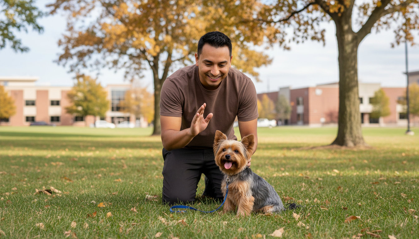 Basic obedience covers sit, down, stay, recall, and loose-leash walking. These skills are the foundation for stress-free visits to the North Branch City Hall park or a local business.