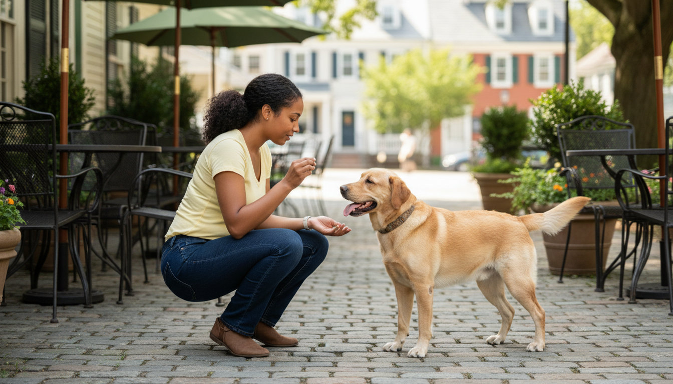 Basic obedience covers sit, down, stay, come, and loose-leash walking. These skills are essential for safe walks along Route 203 or visits to friendly local businesses.