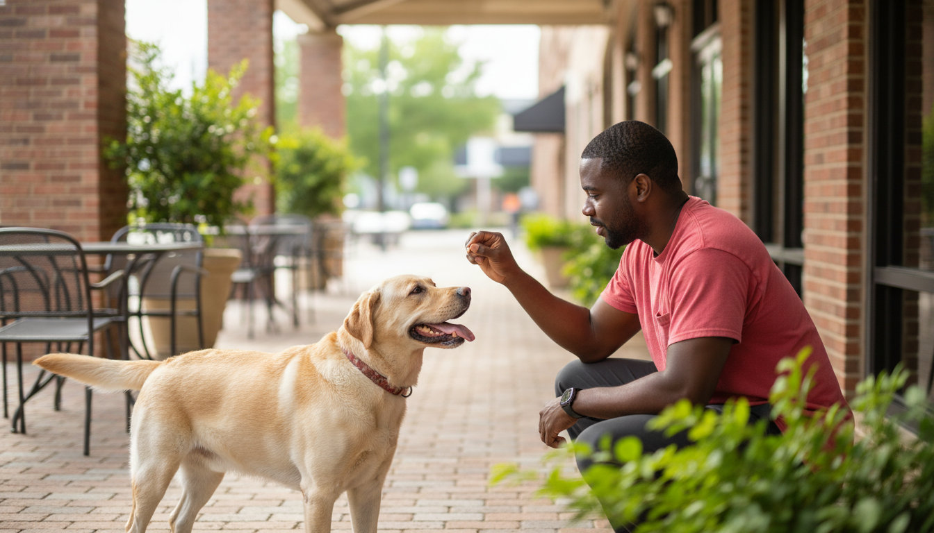 Basic obedience covers sit, stay, come, and loose-leash walking. These are the foundation for safe visits to local spots like the Okmulgee Farmers Market or a stroll through the neighborhood.
