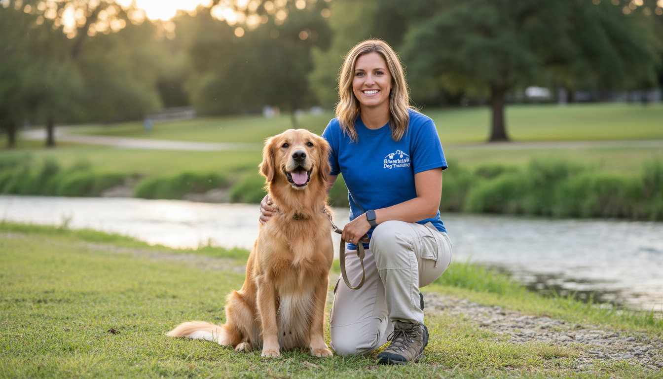 Basic obedience covers sit, down, stay, come, and loose-leash walking. These skills are the foundation for safe visits to the River Park or outdoor dining.