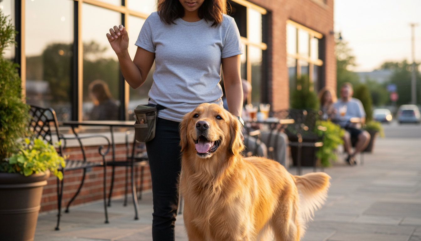 Basic obedience covers sit, down, stay, come, and loose-leash walking. These skills are the foundation for visiting the Royal Oak Public Library patio or walking through downtown without pulling.