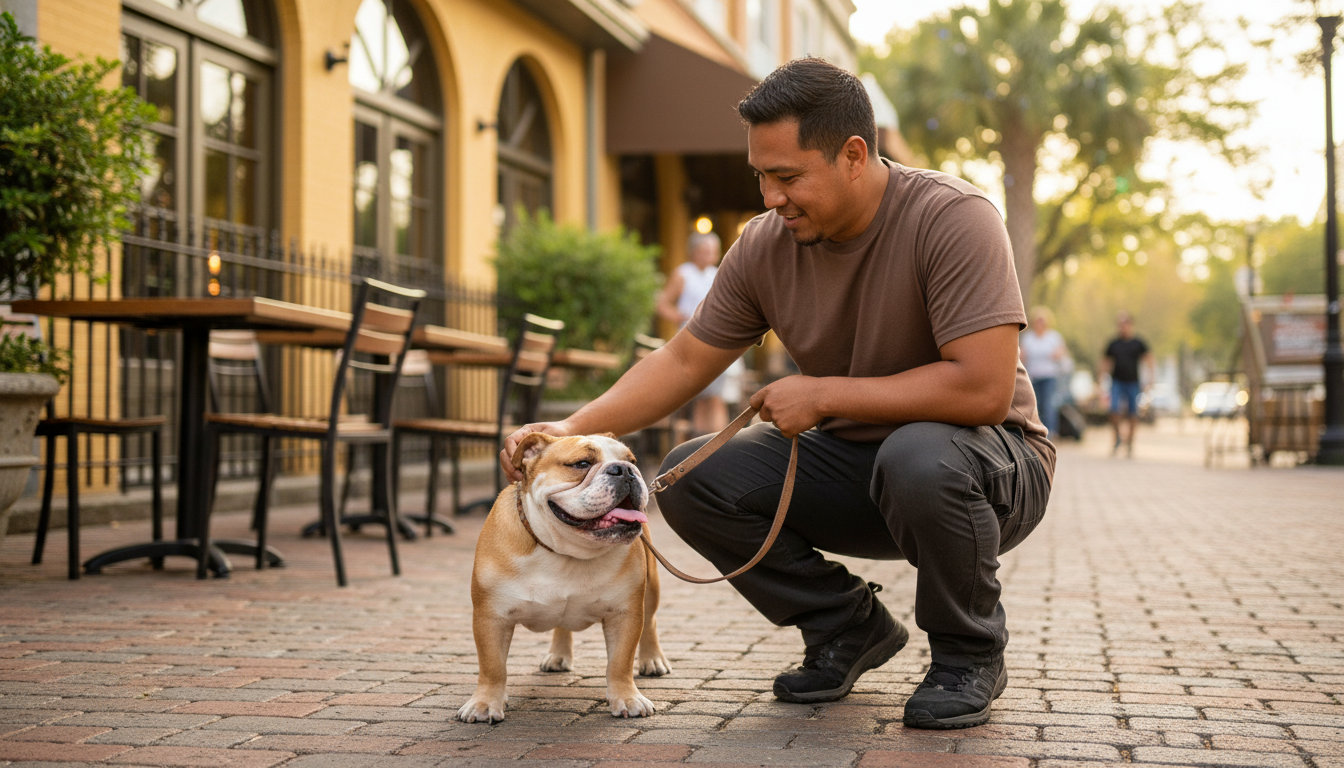 Basic obedience covers sit, down, stay, loose-leash walking, and a reliable recall. These skills are the foundation for safe walks in your neighborhood and visits to outdoor dining areas.