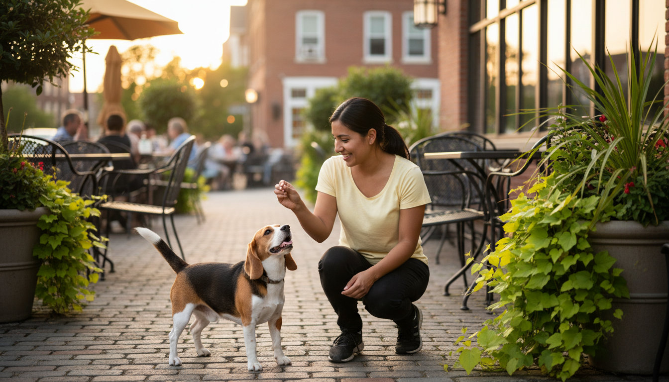 Basic obedience covers essential cues like sit, down, stay, and a reliable recall. These skills are the foundation for calm walks in business districts and polite behavior in pet-friendly stores.