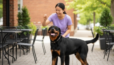 Basic obedience includes skills like sit, down, stay, come, and loose-leash walking. These are the foundation for polite behavior at outdoor dining areas and on shared pathways.